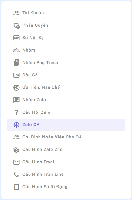 Các Zalo OA này sẽ được lựa chọn trong “Nhóm” phục vụ công tác phân chia cuộc gọi vào/ra theo đầu số cuộc gọi sau này và tiếp nhận các tin nhắn từ khách hàng tới Zalo về tổng đài